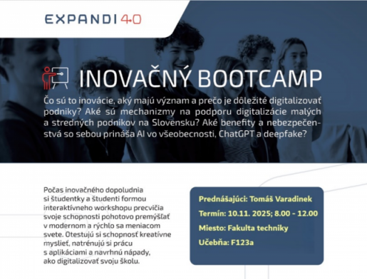 Na Fakulte techniky sa uskutočnil v rámci PC Inovačný bootcamp. Dňa 10.11. 2025 študenti 1. a 2. roč. II. stupňa absolvovali workshop zameraný na digitalizáciu v priemysle. Prednášajúci Tomáš Varadínek zo Slovenskej inovačnej a energetickej agentúry sa snažil v študentoch vzbudiť záujem o inovácie v oblasti digitalizácie a konkurencieschopnosti firiem. Poskytovateľom aktivity je iniciatíva Expandi 4.0. Študentom sa workshop páčil, mali možnosť naplno sa tvorivo prejaviť a možno sa niektorý z nápadov dočká aj realizácie. Ďakujme nášmu inovačnému koučovi Tomášovi Varadínkovi a veríme, že opäť niekedy príde „nabootovať“ našich študentov.